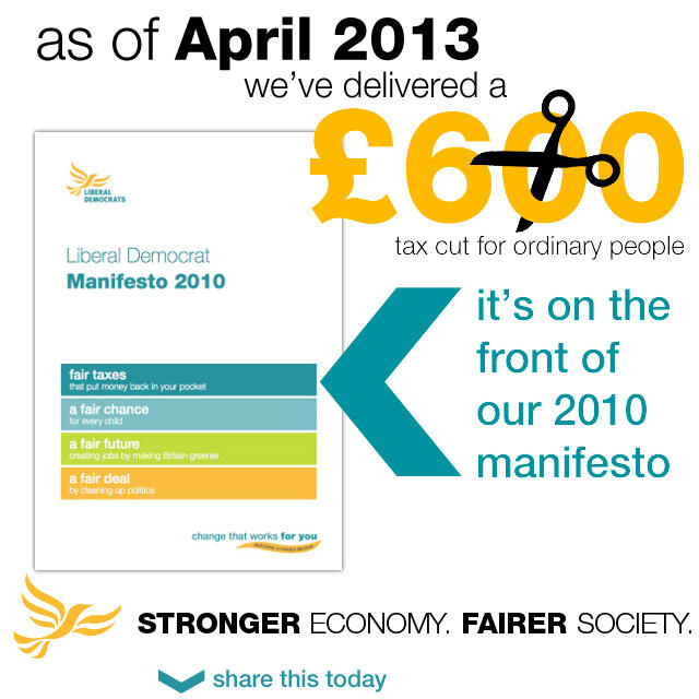 The Liberal Democrats have also unveiled a poster on this subject today as have the Conservatives although many Lib Dems are furious that the Conservatives are trying to take the credit for this change. As the Lib Dem poster shows the pledge to raise the threshold was on the front of the Lib Dem manifesto and it is simply disingenuous for the Tories to suggest it is happening because of them, as the only tax change promised in the Conservative 2010 manifesto was to raise the threshold for inheritance tax to one million pounds, the pledge George Osborne made in 2007 that frightened Gordon Brown out of call a snap general election.