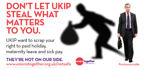 Trade Unions for Labour launched a poster campaign on today to 'warn' workers that UKIP favours scrapping basic rights for workers to maternity leave, sick pay, and paid holiday. The message will be taken on the road over the Bank Holiday weekend to highlight UKIP’s hidden commitment to scrap the workplace rights, including paid holiday, maternity leave and sick pay relied upon by the 31 million working people in the UK.